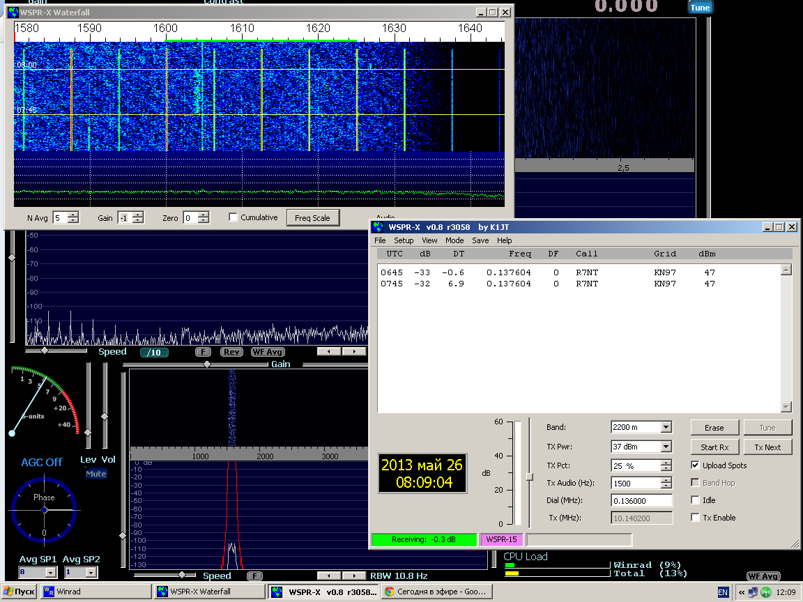 да я просто обалдел  что он в оп8 так прилетит сюда , щас прием гоняю на двух звуковухах друг за дружкой зацепленных по проводам , на одной WinRad  на другой wsprx и opera , сначала пробовал по виртуальному кабелю через винрад принимать чет мне непонравилось , потом нарыл звукокарту воткнул ее зацепил все и щас так юзаю , пока не понял лучше через WinRad или все также покрайней мере врубил в нем noise blanker на всю железку и грозовую трескотню придавливает и полезный сигнал кстати тоже но небольшой выигрыш есть , все жду когда чайку врубят в сызрани на ней сравню как бланкер ее будет давить