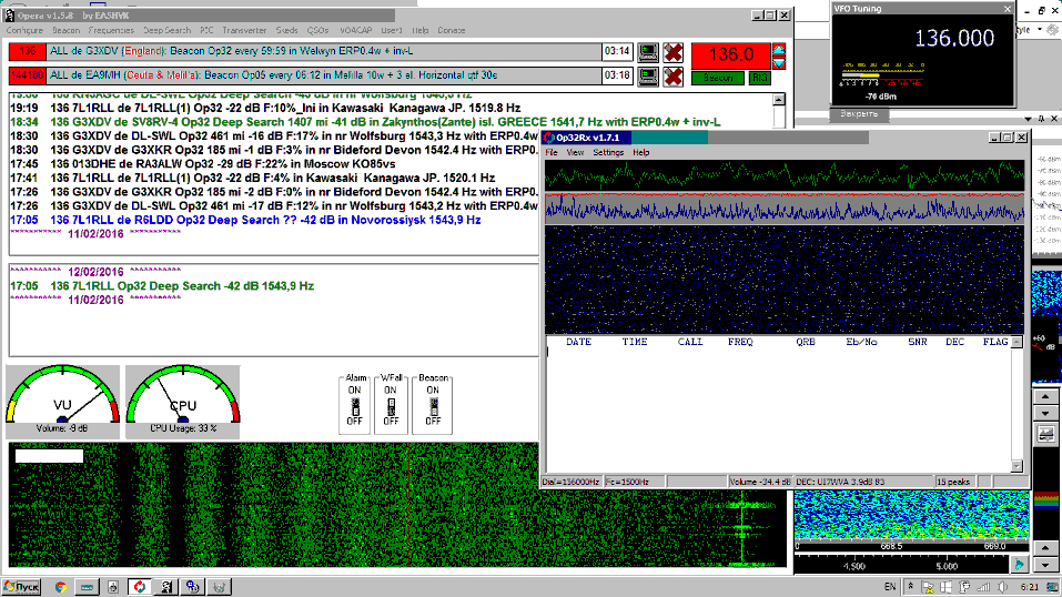 18:31 136 G3XDV de SV8RV Op32 2265 km -36 dB F:13% in Zakynthos(Zante) isl.GREECE 1541,9 Hz with ERP0.4w + inv-L