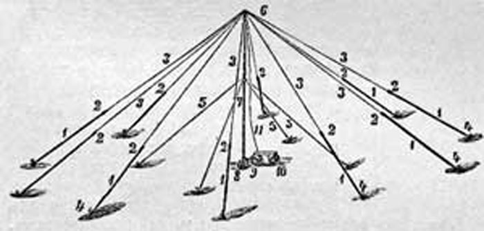 Можно пользоваться или бамбуковыми кольями с изоляторами от противовесов или, если имеются под руками, - шестами полевой телеграфной линии, или наконец класть провода на ветки деревьев. (Здесь не требуется такой хорошей изоляции, как при обыкновенных антеннах).
