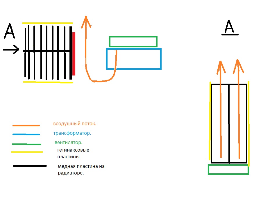 Сечение магнитопровода  получилось 6 см.кв. Вторичка  4 мм.кв. по меди, греться не должно - ток в антенне я никогда до 40А не разгоню. Первичка ~3 мм.кв. Усреднённое значение длительной токовой нагрузки на провода 10 А на 1 кв.мм. для меди.  Вроде все с запасом планировал. Да и "постамент" для трансформатора  думал для миниизации площади опоры. Про охлаждение это был мой следующий вопрос - один из вариантов был вентилятор сверху, обдувать трансформатор  с выходом воздушного потока на 2 стороны для обдува медных пластин на радиаторах. На эскизе набросал вариант, который планирую. Красоту снять недолго.:) Спасибо за совет!