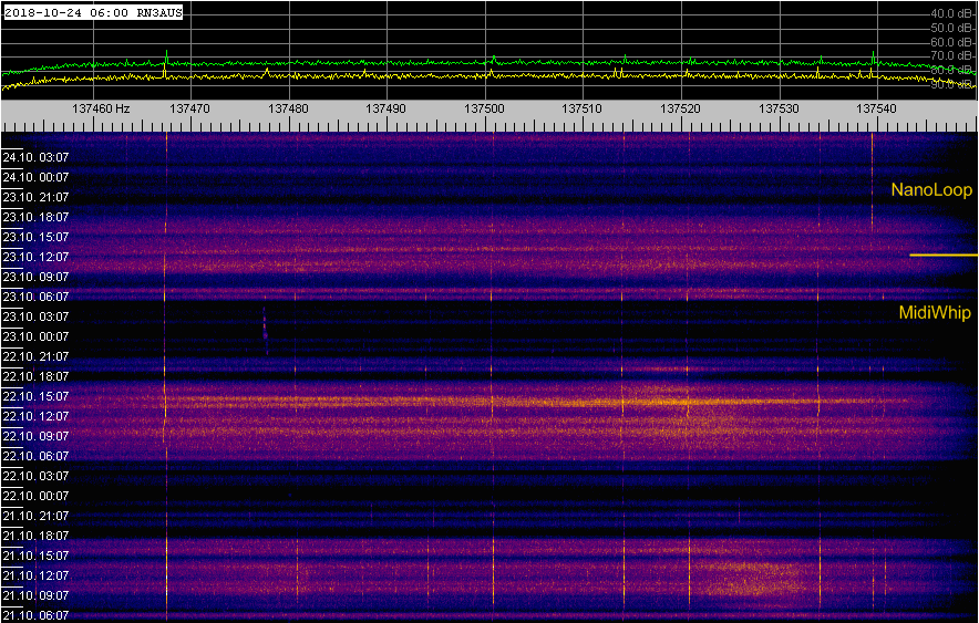 В течение нескольких дней сравнивал качество приема между моим довольно большим Мидивипом (когда нет помех, прием на него превосходный) и NanoLoop`ом, установленным на той же мачте. Скриншоты показаны ниже. Получается, что магнитная антенна проигрывает мидивипу примерно 3 дБ в отношении сигнал-шум, сила сигнала с антенн одинакова.